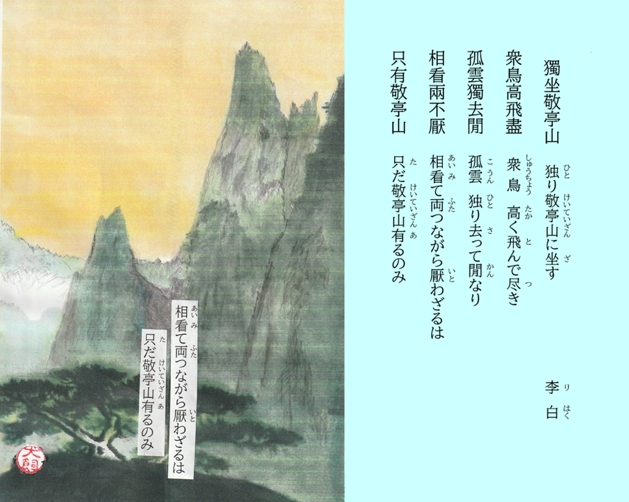 この詩は天宝12年(753)、李白(701ー762)53歳時の作。李白は天宝3年、讒により楊貴妃に疎まれて長安を去ってから各地に歴遊し多くの名士・詩人と交わった後、天宝12年の秋に宣城に到った。宣城はかねて彼の敬慕する六朝の詩人謝朓が太守となり「敬亭山詩」を遺した処。李白は早速この山を訪れ、独り秀峰に対座して万感の思いを此の詩に託した。詩は五言絶句の短い構成乍ら内容のこもった味わい深いものとなっている。起句・承句には隠逸詩人陶潜の詩のおもむきを漂わせるわせる一方で、敬亭山の自然を擬人化した詩の構成により、これまで自ら交遊した多くの人士を衆鳥に、また謝朓を孤雲に擬しているように見える。人間(じんかん)の変転と関わり無く悠然と拡がる山々の大自然と一体化して独り坐す自らの心情を見事に詠じたもので、その姿を眼前に髣髴とさせてくれるような傑作です。以上(玉井幸久氏)